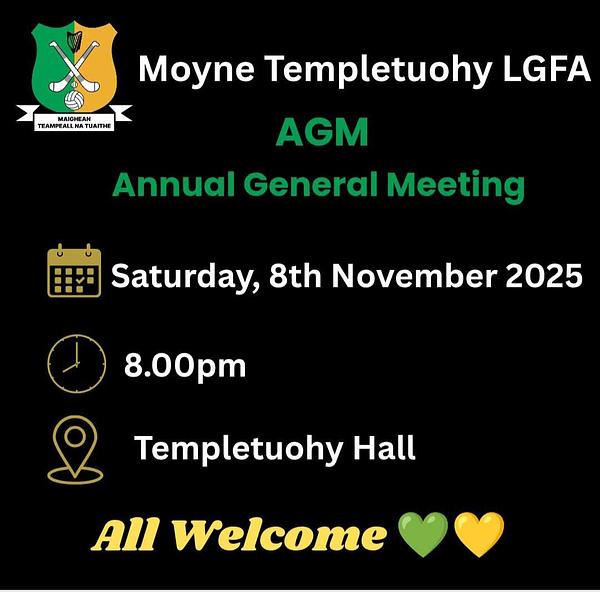 Moyne Templetuohy Ladies Football Club will hold their Annual General Meeting on Saturday 8th November 2025 at 8pm in Templetuohy Hall.