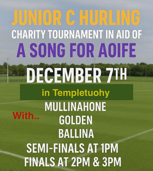 The club will run a one day Junior C hurling tournament on Sunday, December 7th in Templetuohy. The clubs involved are our own Junior C’s, Mullinahone, Ballina and Golden Kilfeacle. All proceeds from the day will go towards A Song for Aoife, whose chosen charities are the Dillon Quirke Foundation and Children’s Grief Centre, Limerick. There will be donation buckets around the grounds on the day so we would love to see a great crowd there. Semi-finals begin at 1pm with plate and cup finals taking place at 2pm and 3pm.