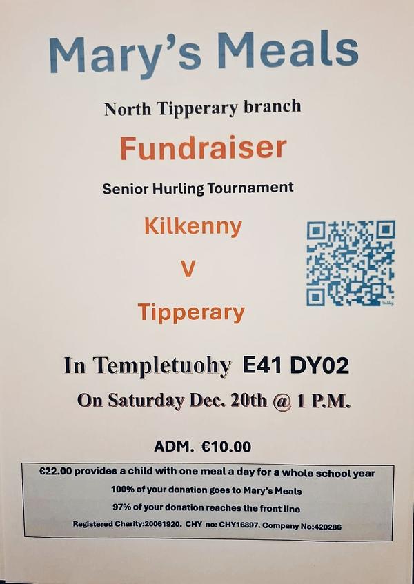 We are delighted to be hosting Tipperary V Kilkenny this Saturday 20th December in the Senior Hurling Charity Challenge Match in aid of Mary’s Meals admission is €10 on the gate. Throw in is at 1pm in Templetuohy.