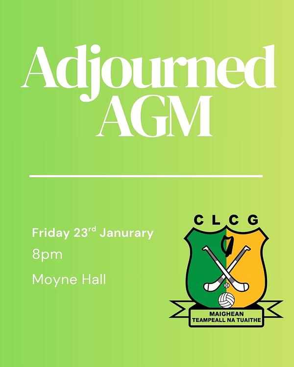 The Senior Club's Adjourned AGM will take place on Friday the 23rd of January at 8pm in Moyne Community Centre. All are welcome to attend. We would like to see a good crowd in attendance.