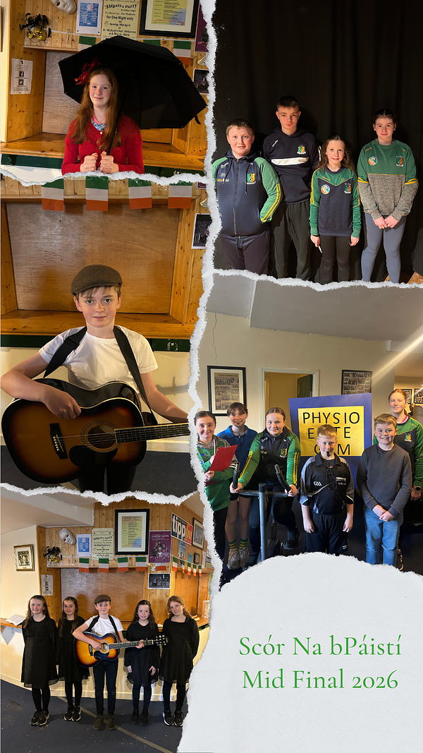 Well done to all who represented us at the Mid Final of Scór Na bPáistí in Holycross today. We were proudly represented in the Solo Singing, Recitation, Ballad Group, Quiz Team and Novelty Act categories. A special well done to our ballad group who were runners up on the day. Thanks to all who gave their time in helping all groups to prepare 💚💛