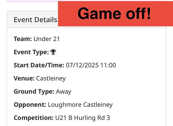 The u21 hurling game that was due to take place tomorrow, Sunday 7th in Castleiney has been called off as Loughmore-Castleiney have conceded the match.