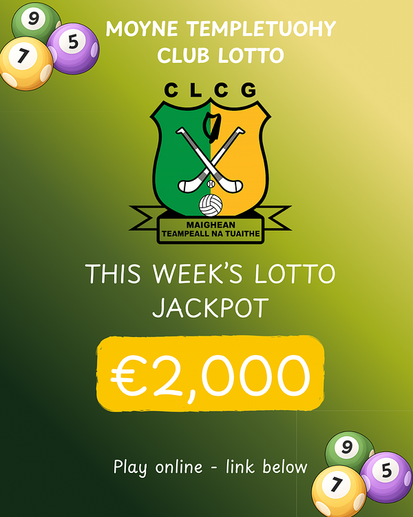 Win our €2,000 lotto jackpot this Thursday evening for as little as a €2 ticket!! Play our lotto draw online before 6pm Thursday, by clicking the link below, through ClubZap or by buying tickets at any of the local shops and pubs.